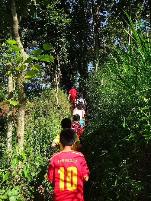 3) Yaakkk….lemparkan bolanya supaya masuk ke ember kecil di atas kepala…selingan permainan di sela-sela perjalanan trekking.