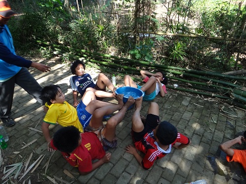 6) Waduh….tantangan seru lagi nih…ayo jangan sampai tumpah air di mangkuk…sampai semua angggota kelompok selesai memasang sepatunya ya.