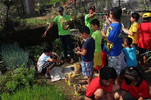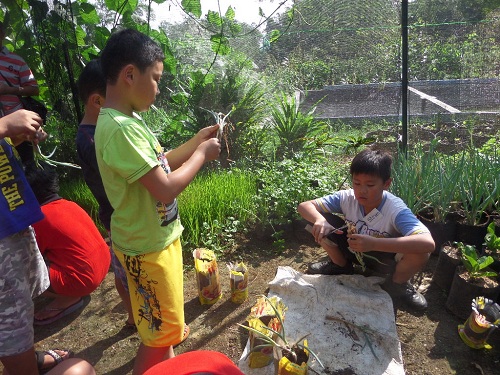 4) Anak-anak mendengarkan kakak pembina menjelaskan bagaimana cara menanam bawang prei sambil langsung mencobanya sendiri.