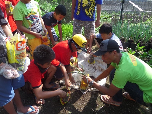 3) Kemasan minyak yang sudah dicuci dan dipotong dengan motif bebas sebagai dekorasi, diisi dengan kompos hasil pengolahan sampah organik yang dicampur dengan tanah.