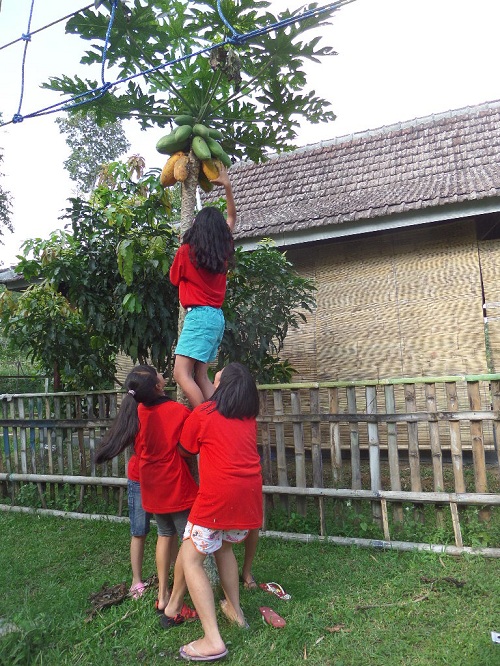 11) Pelan-pelan… naik ke tangan kami, raih ke kanan sedikit, yaakk….ayo petik pepayanya.