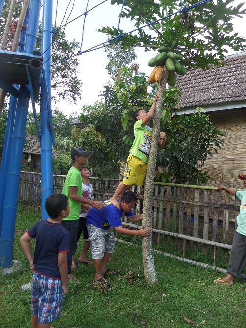 12) Kalau kelompok kami, kami beri nama kelompok “Indah” , kerjasama petik pepaya dengan didukung di atas punggung aja gini deh…hupp, naahh….berhasil kuraih dan kupetik pepaya yang matang.