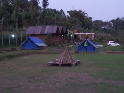 1) Suasana menjelang senja di sekitar camping ground d’sa dengan tenda-tenda yang mengelilinginya dan susunan kayu di tengah lapangan untuk persiapan acara api unggun di malam harinya.