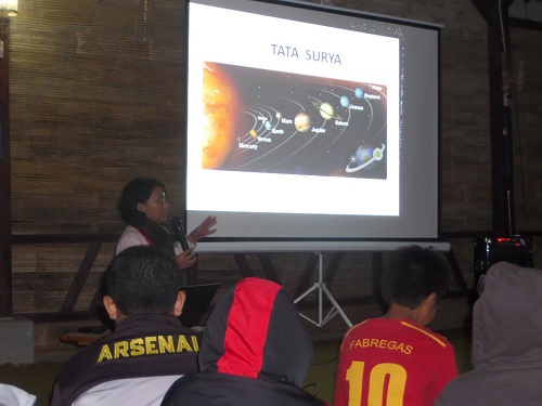 2) Akhirnya malam telah tiba. Kami tekun mendengarkan penjelasan Ibu Caecilia Triastuti mengenai bagaimana tata surya terbentuk dan karakteristik planet-planet anggotanya….wow, luar biasa karya ciptaan Tuhan di alam semesta yang maha luas ini.