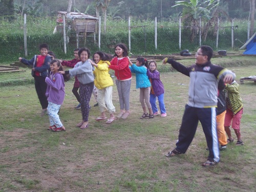 2) Tuut..tutt…yo kita berlari-lari kecil membentuk rangkaian dan menggerak-gerakkan badan sambil mengusir dingin dan menyehatkan badan.